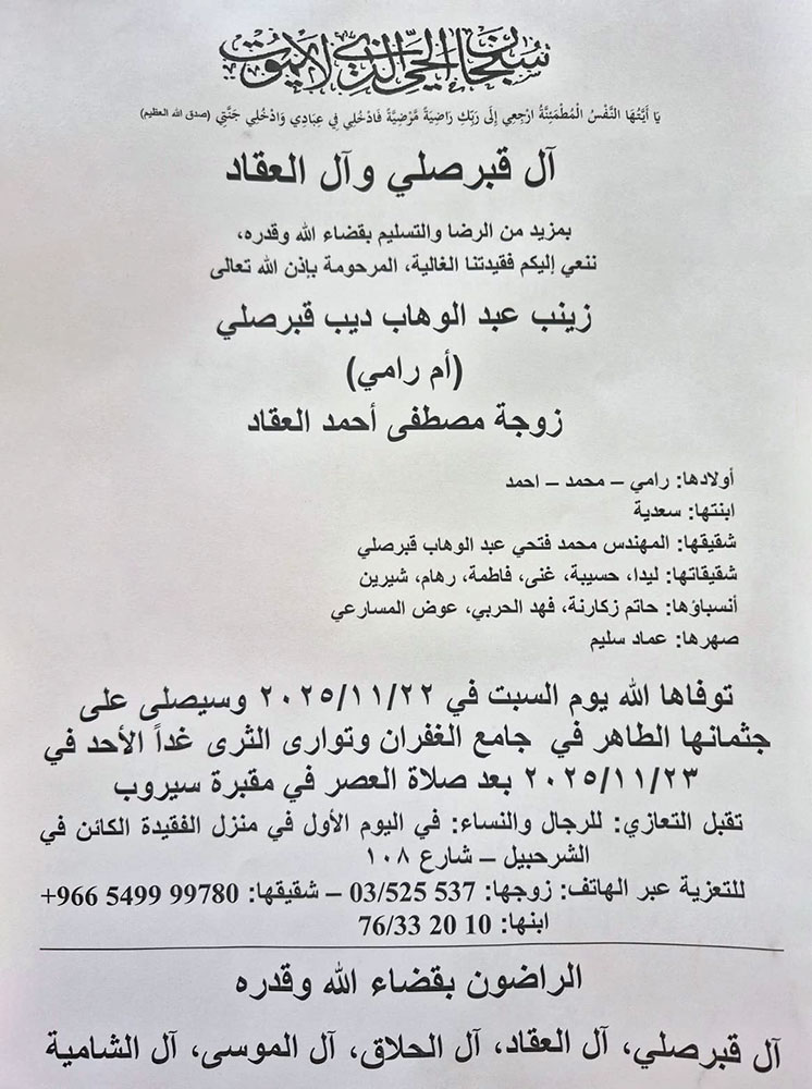 زينب عبد الوهاب ديب قبرصلي (أم رامي - زوجة مصطفى العقاد) في ذمة الله