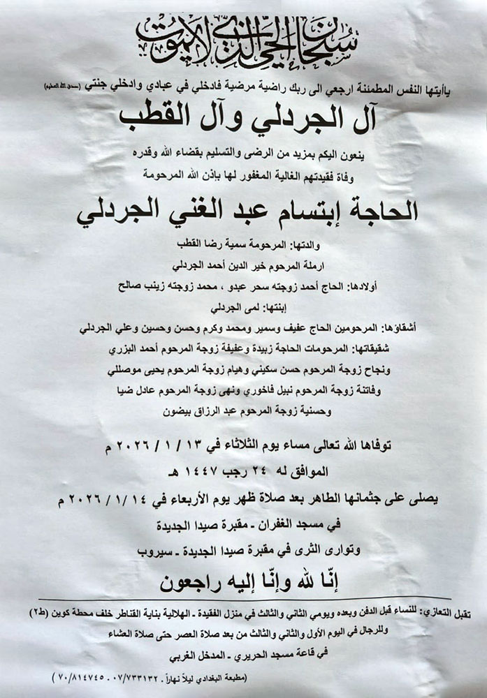 الحاجة إبتسام عبد الغني الجردلي (أرملة خير الدين الجردلي) في ذمة الله