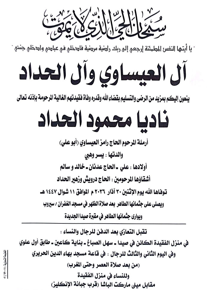 ناديا محمود الحداد (أرملة الحاج رامز العيساوي - أبو علي) في ذمة الله
