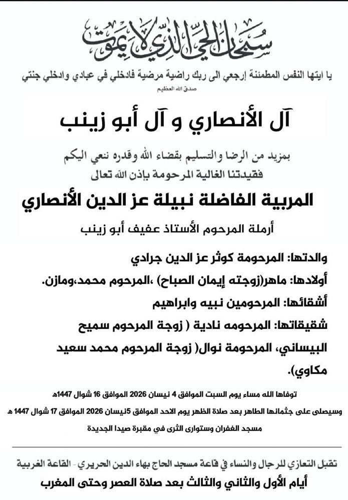 المربية الفاضلة نبيلة عز الدين الأنصاري (أرملة الأستاذ عفيف أبو زينب) في ذمة الله