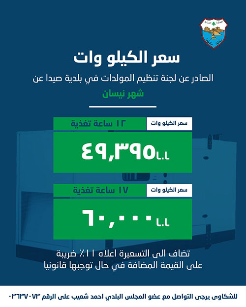 لجنة تنظيم قطاع المولدات في بلدية صيدا أصدرت بيان تكلفة الاشتراكات الكهربائية لشهر نيسان 2026
