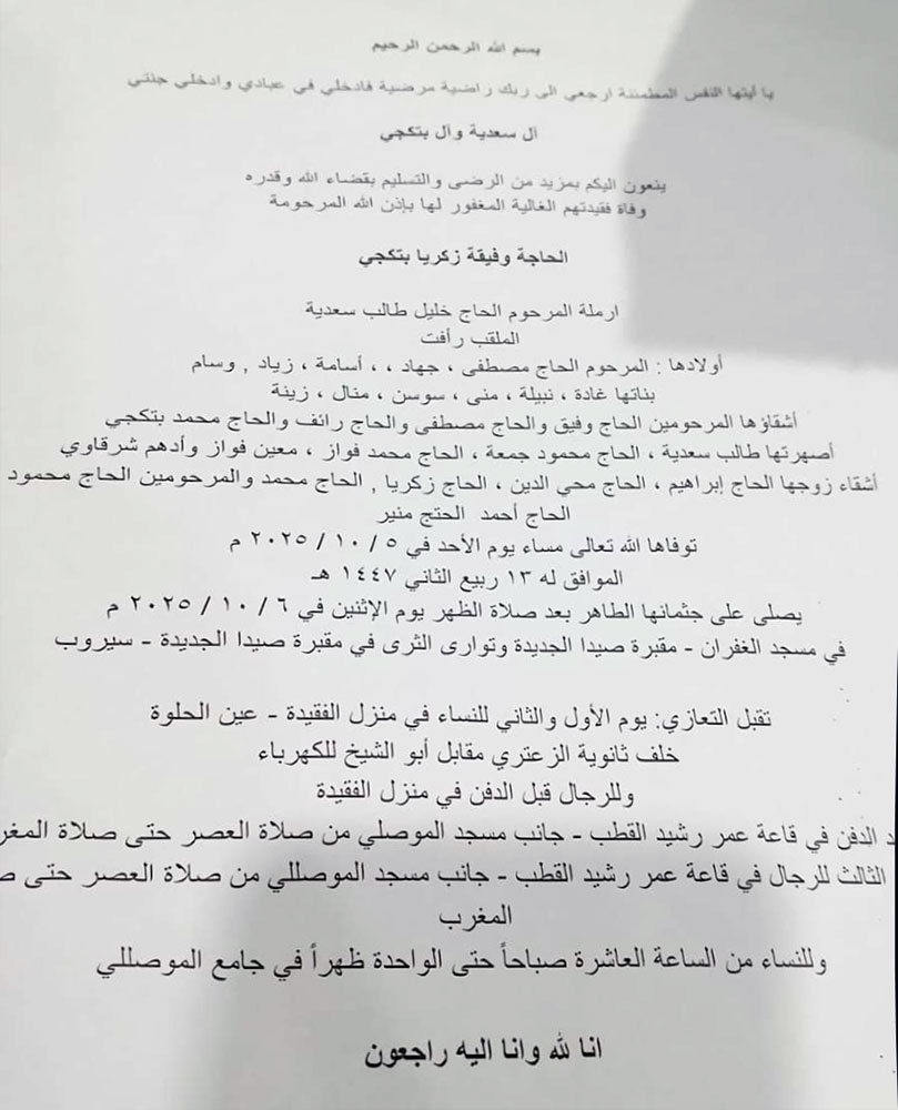 الحاجة وفيقة زكريا بتكجي (أرملة الحاج خليل سعدية) في ذمة الله
