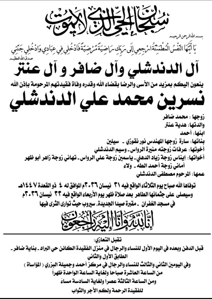 نسرين محمد علي الدندشلي (زوجها محمد ضافر) في ذمة الله