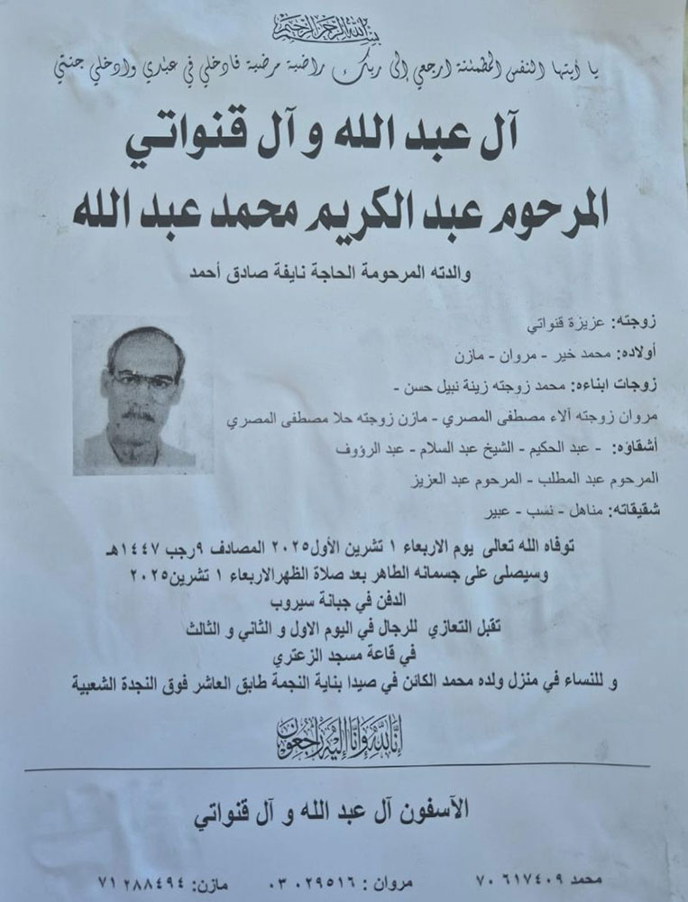 الحاجة زينب رياض الديراني (أرملة هلال بسيوني - أبو فؤاد) في ذمة الله