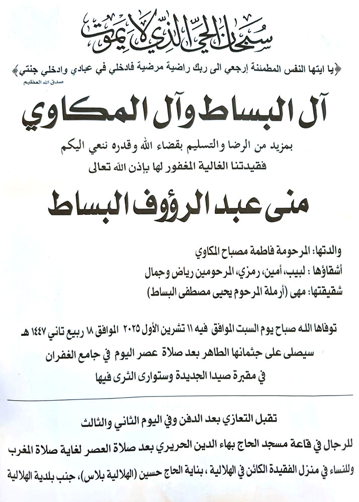 الحاجة وفيقة زكريا بتكجي (أرملة الحاج خليل سعدية) في ذمة الله