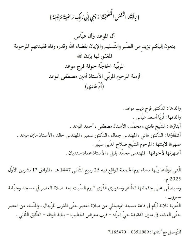 المربية الحاج خولة فرج موعد (أم فادي - أرملة المربي الأستاذ أمين الموعد) في ذمة الله