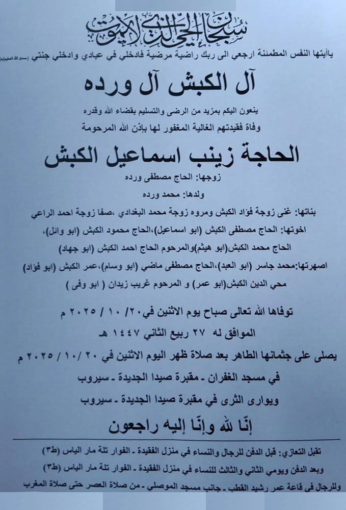 الحاجة زينب إسماعيل الكبش (زوجة الحاج مصطفى وردة) في ذمة الله