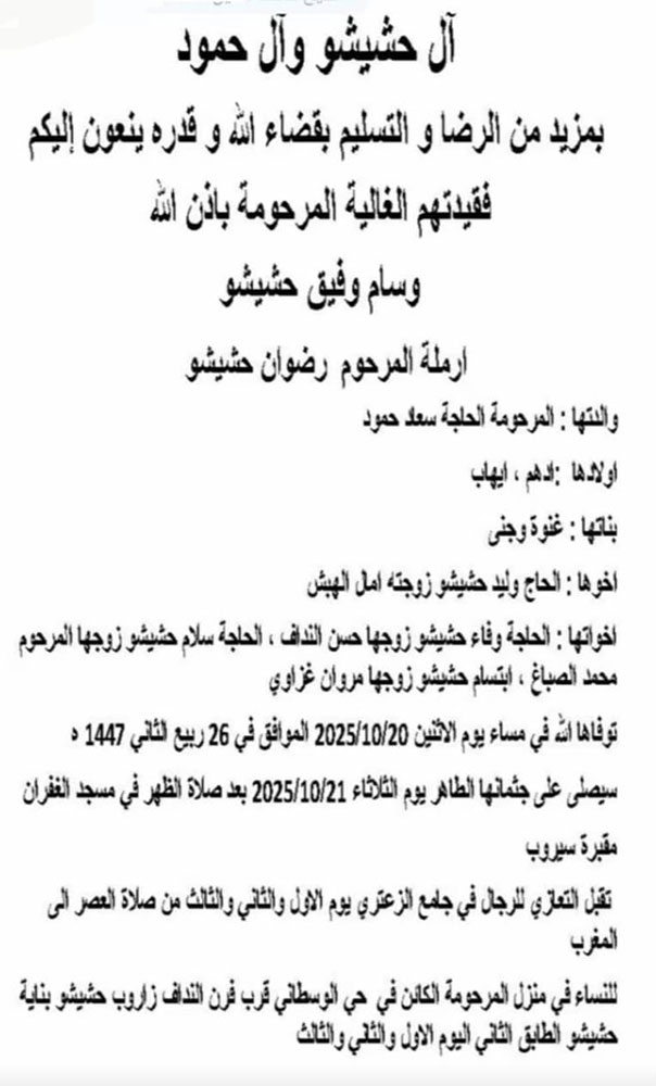 وسام وفيق حشيشو (أرملة رضوان حشيشو) في ذمة الله