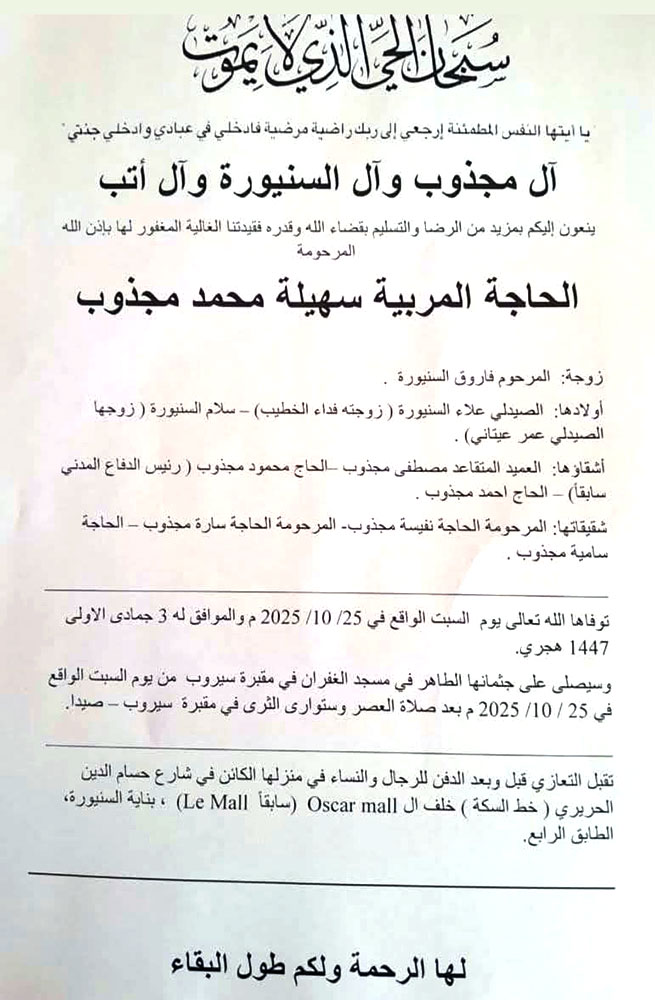 الحاجة المربية سهيلة محمد مجذوب (أرملة فاروق السنيورة) في ذمة الله