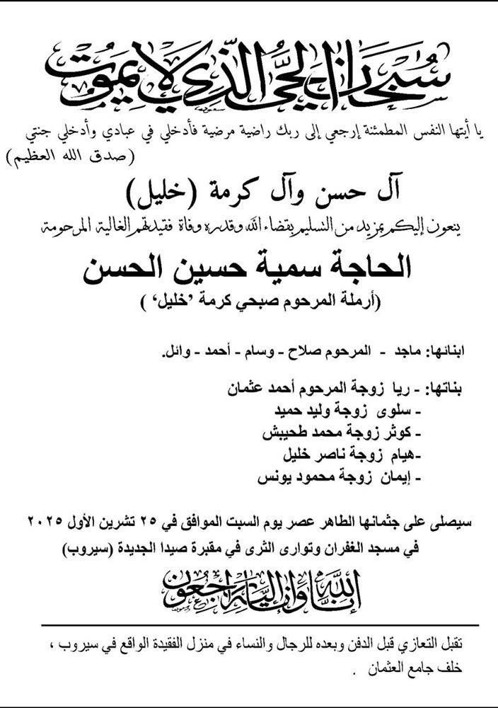 الحاجة سمية حسين الحسن (أرملة صبحي كرمة "خليل") في ذمة الله