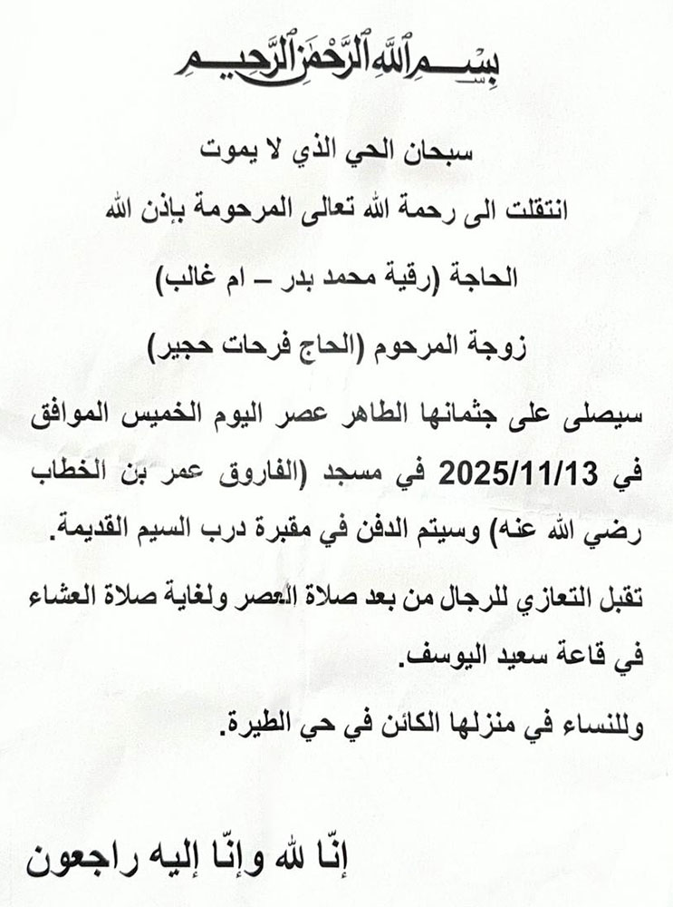 الحاجة رقية محمد بدر (أم غالب - أرملة الحاج فرحات حجير) في ذمة الله
