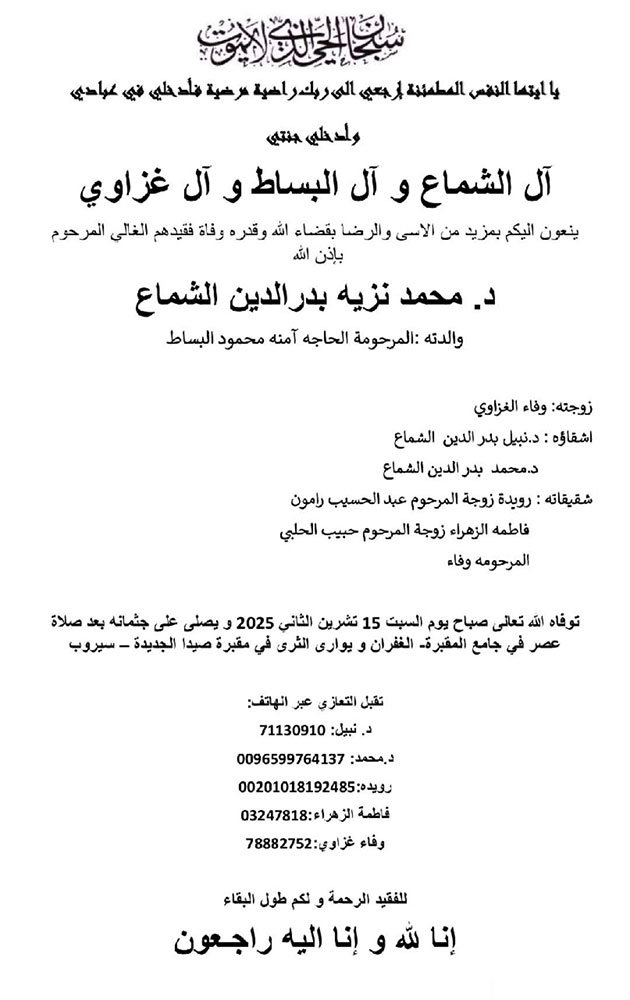 د. محمد نزيه بدر الدين الشماع في ذمة الله