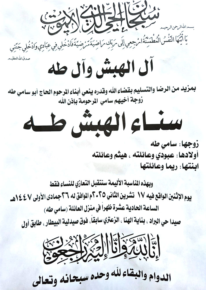 سناء الهبش (زوجة سامي طه) في ذمة الله