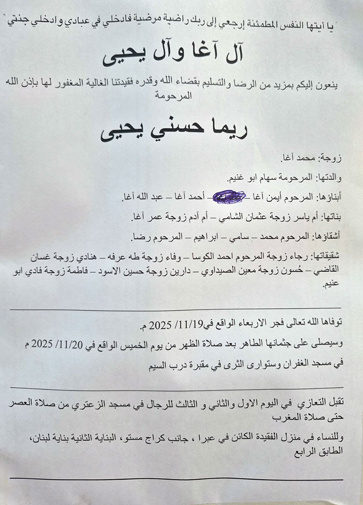 ريما حسني يحيى (زوجة محمد آغا) في ذمة الله