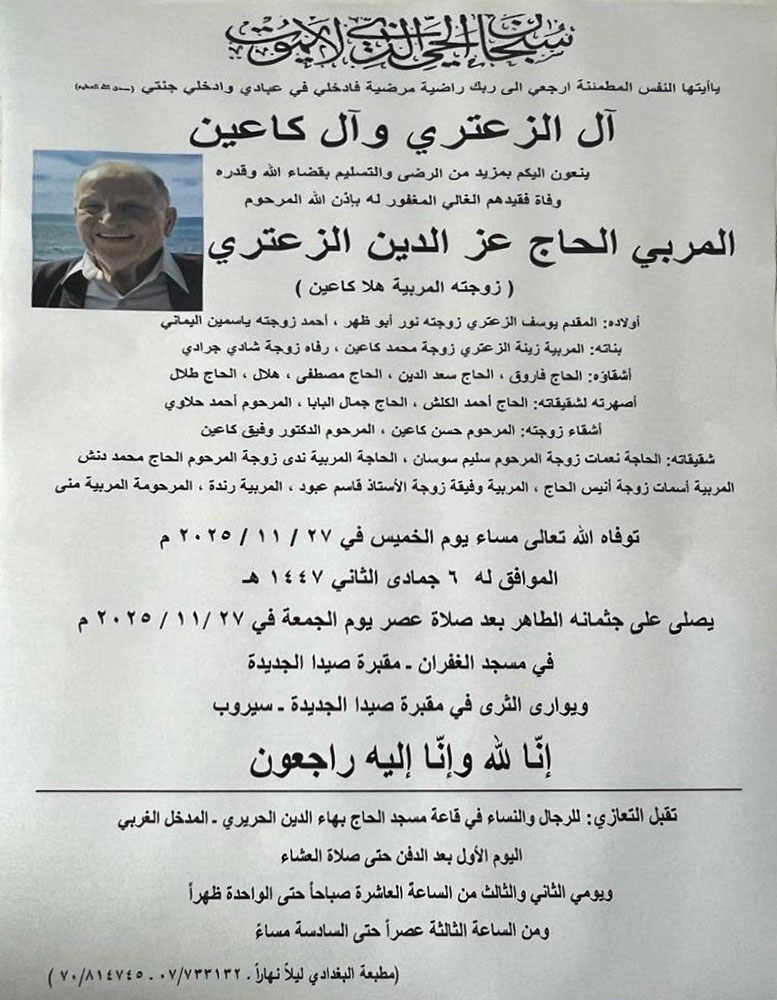 المربي الحاج عز الدين الزعتري (زوجته المربية هلا كاعين) في ذمة الله