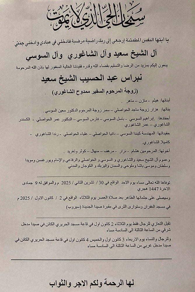 المربية الفاضلة الحاجة سهيلة محمد منياتو (أرملة الحاج مصطفى صفدية) في ذمة الله