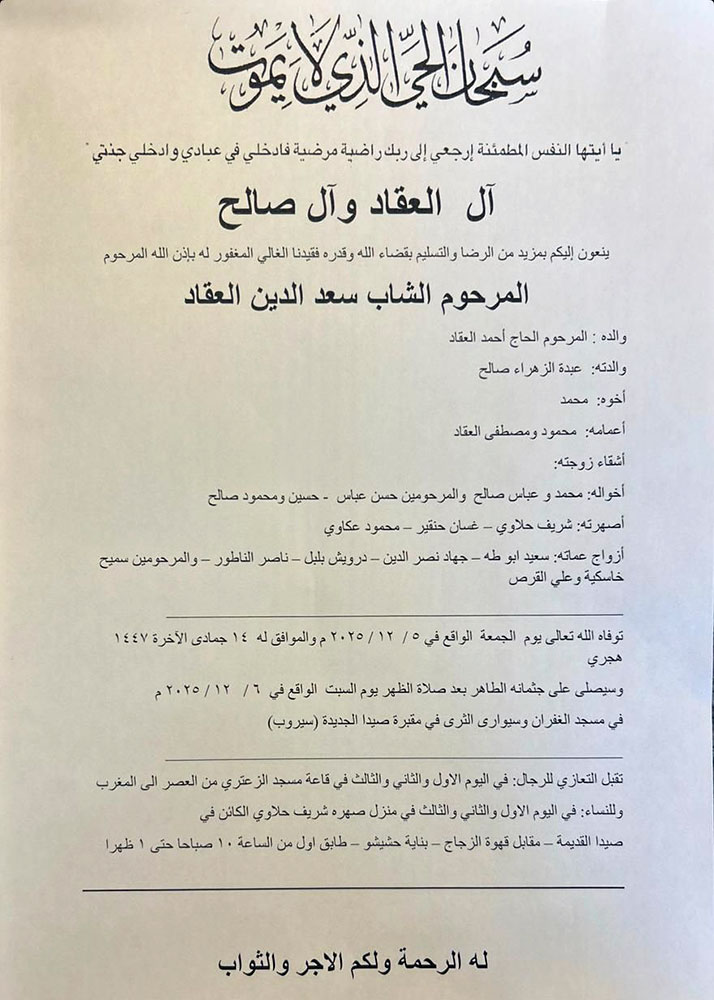 الشاب سعد الدين أحمد العقاد في ذمة الله