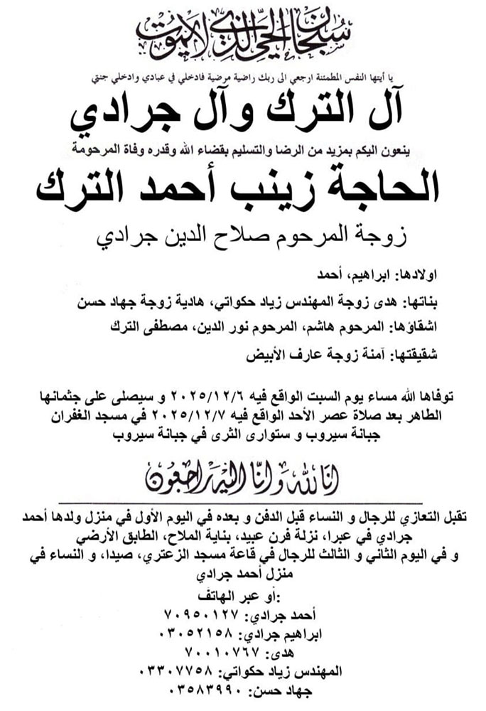 الحاجة زينب أحمد الترك (أرملة صلاح الدين جرادي) في ذمة الله