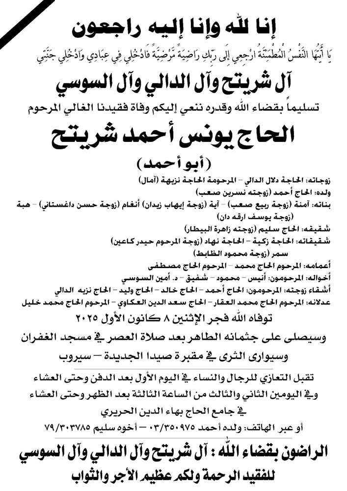 الحاج يونس أحمد شريتح (أبو أحمد) في ذمة الله