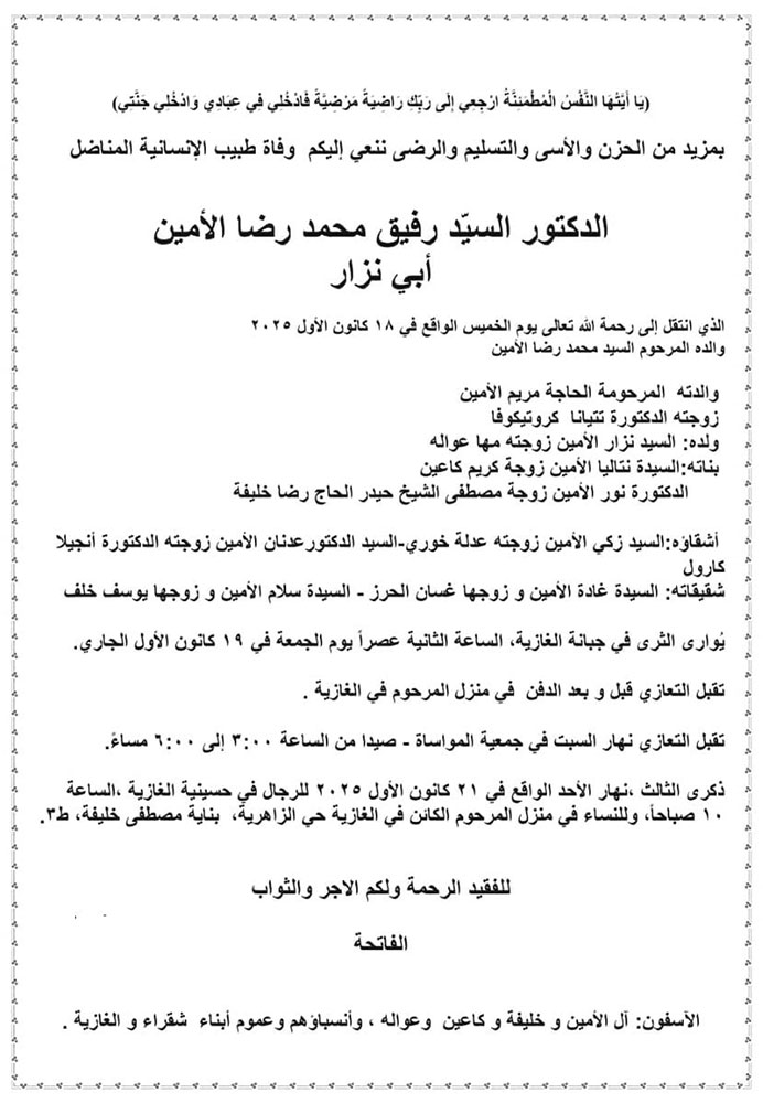 الدكتور السيد رفيق محمد رضا الأمين (أبو نزار) في ذمة الله
