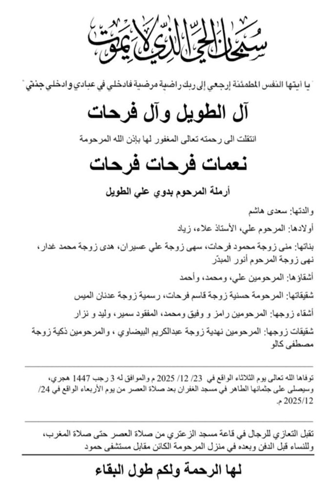 نعمات فرحات فرحات (أرملة بدوي الطويل) في ذمة الله