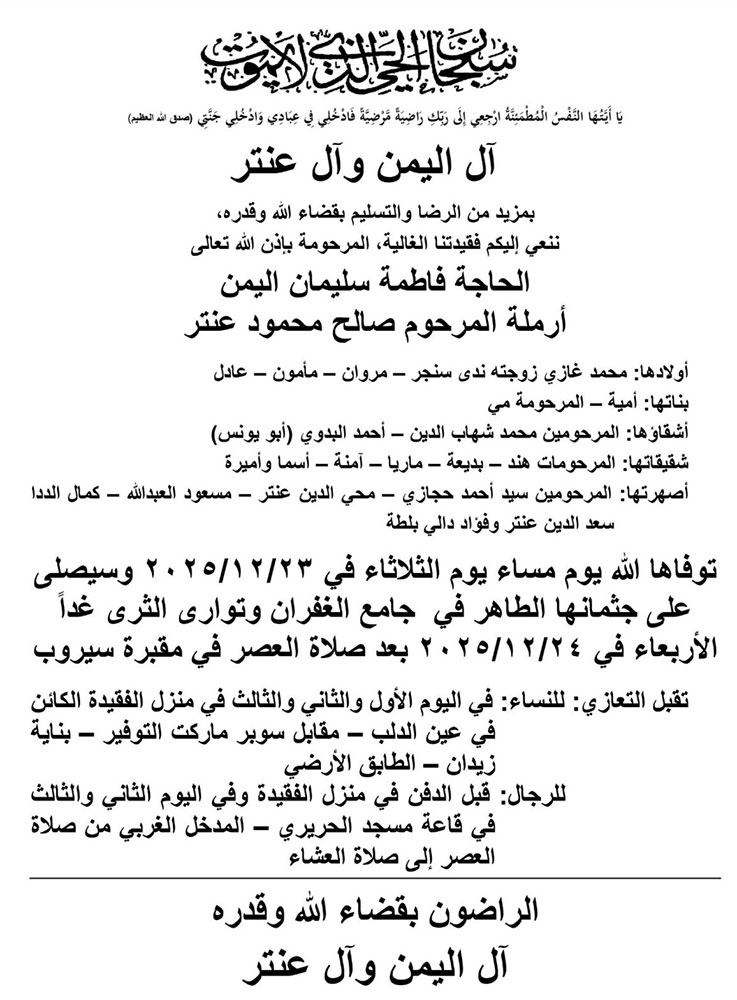 الحاجة فاطمة سليمان اليمن (أرملة صالح عنتر) في ذمة الله