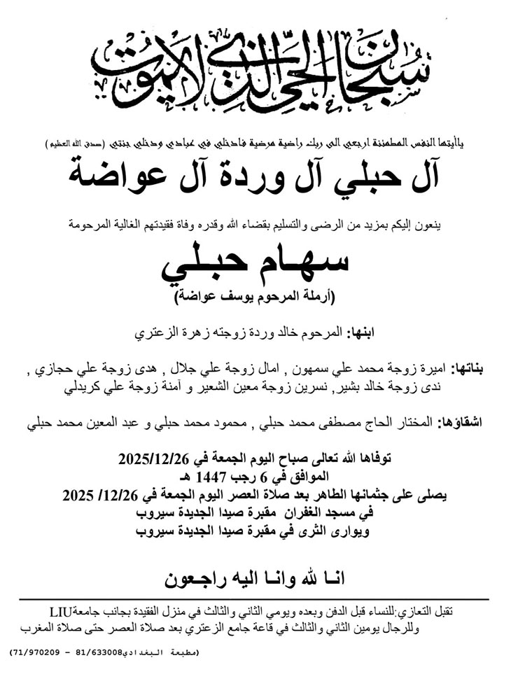 سهام محمد حبلي (أرملة يوسف عواضة) في ذمة الله
