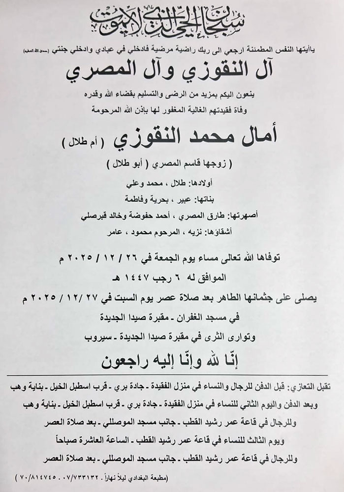 أمال محمد النقوزي (أم طلال - زوجة قاسم المصري) في ذمة الله