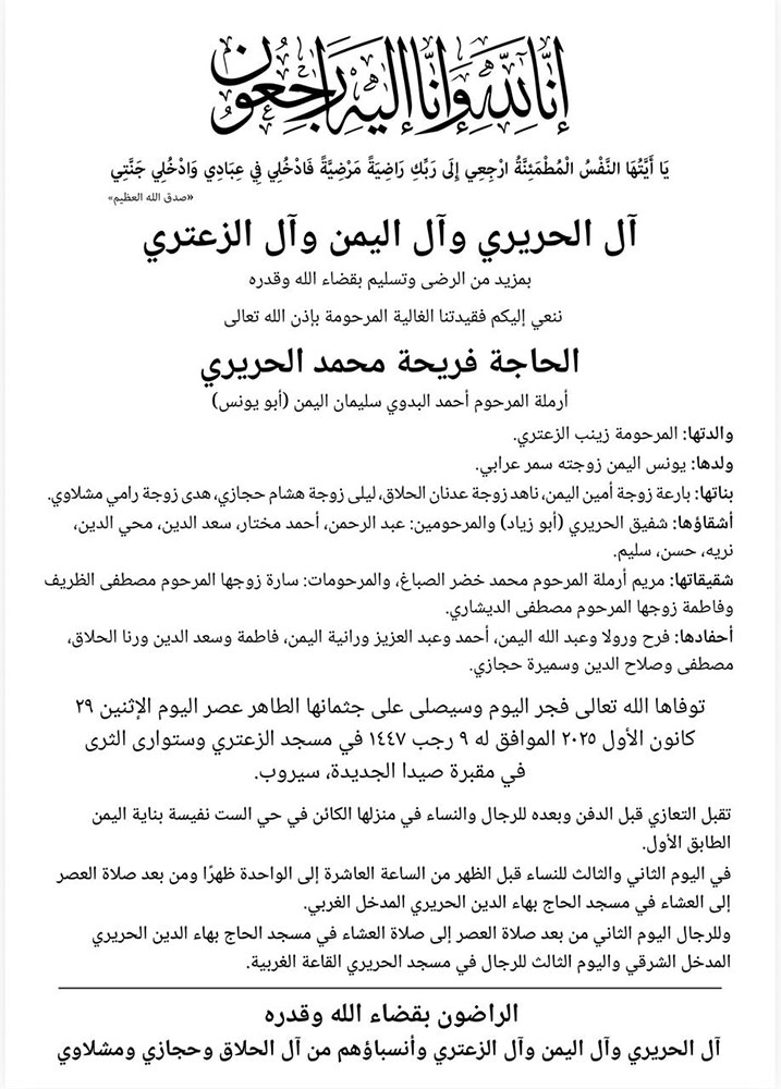 الحاجة فريحة محمد الحريري (أرملة أحمد اليمن - أبو يونس) في ذمة الله