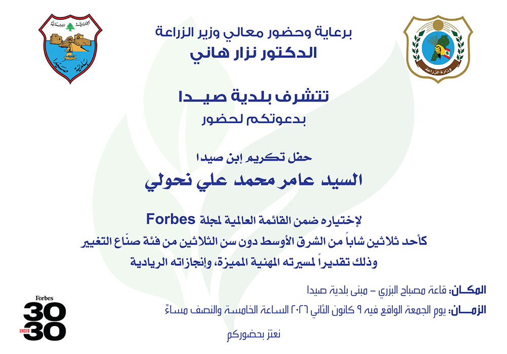 برعاية وزير الزراعة: بلدية صيدا تدعوكم لحضور حفل تكريم ابن صيدا السيد عامر محمد علي نحولي