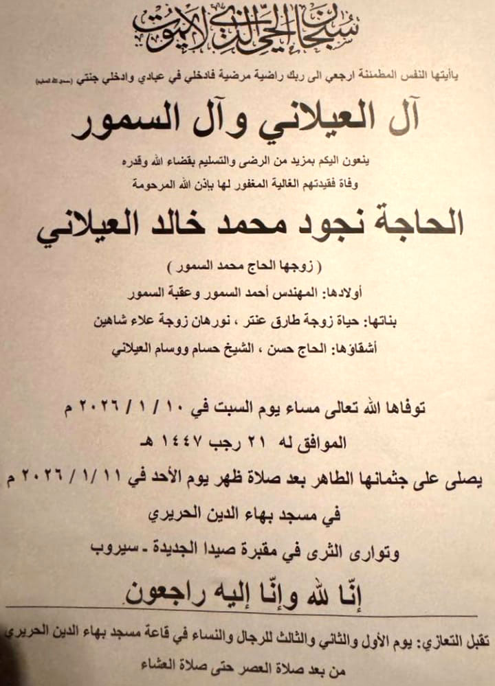 الحاجة نجود محمد خالد العيلاني (زوجة الحاج محمد السمور) في ذمة الله