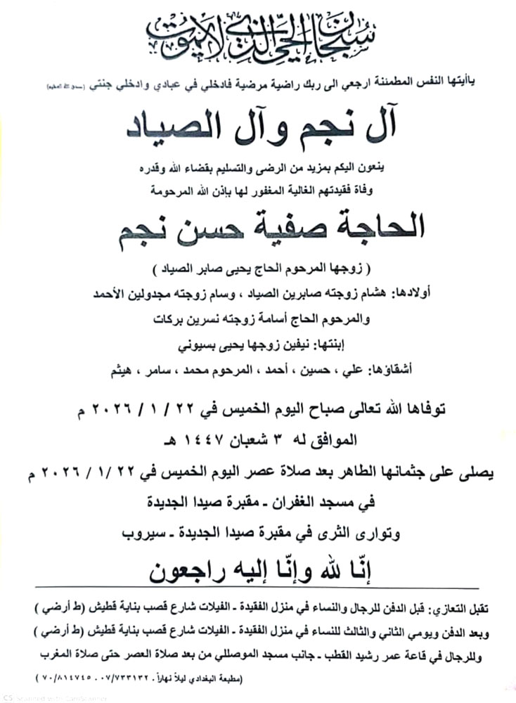 الحاجة صفية حسن نجم (أرملة الحاج يحيى الصياد) في ذمة الله