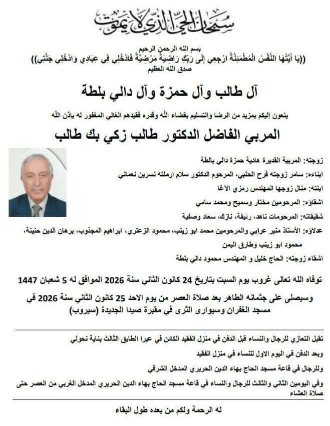 المربي الفاضل الدكتور طالب زكي بك طالب في ذمة الله
