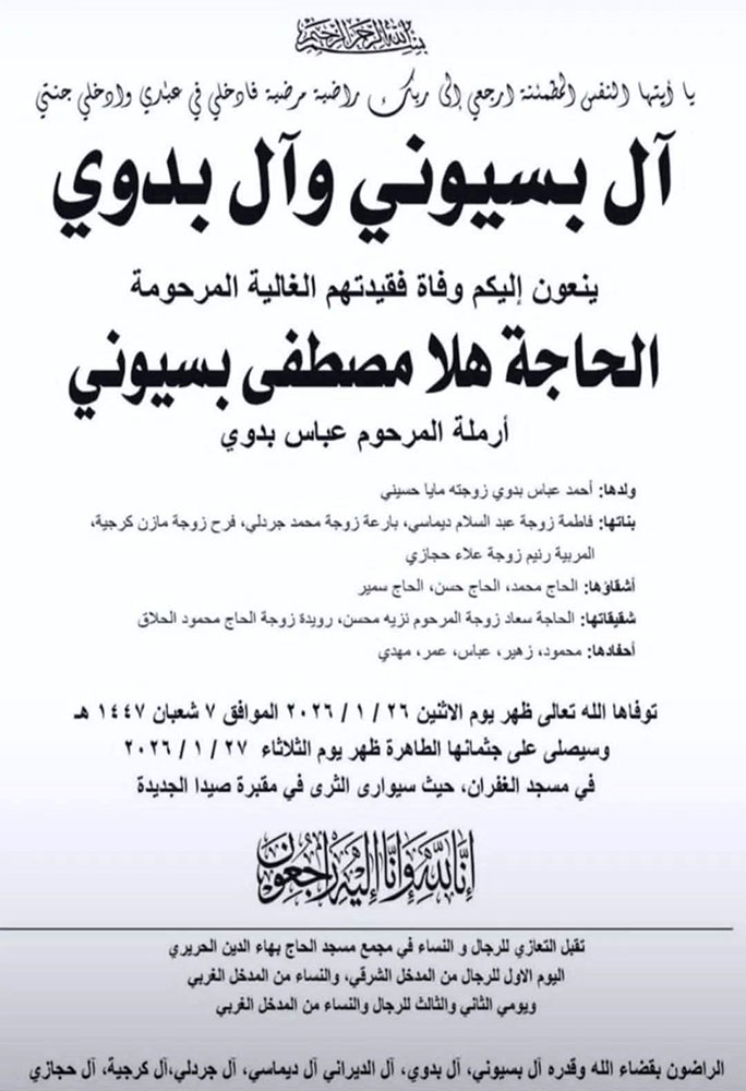 الحاجة هلا مصطفى بسيوني (أرملة عباس بدوي) في ذمة الله