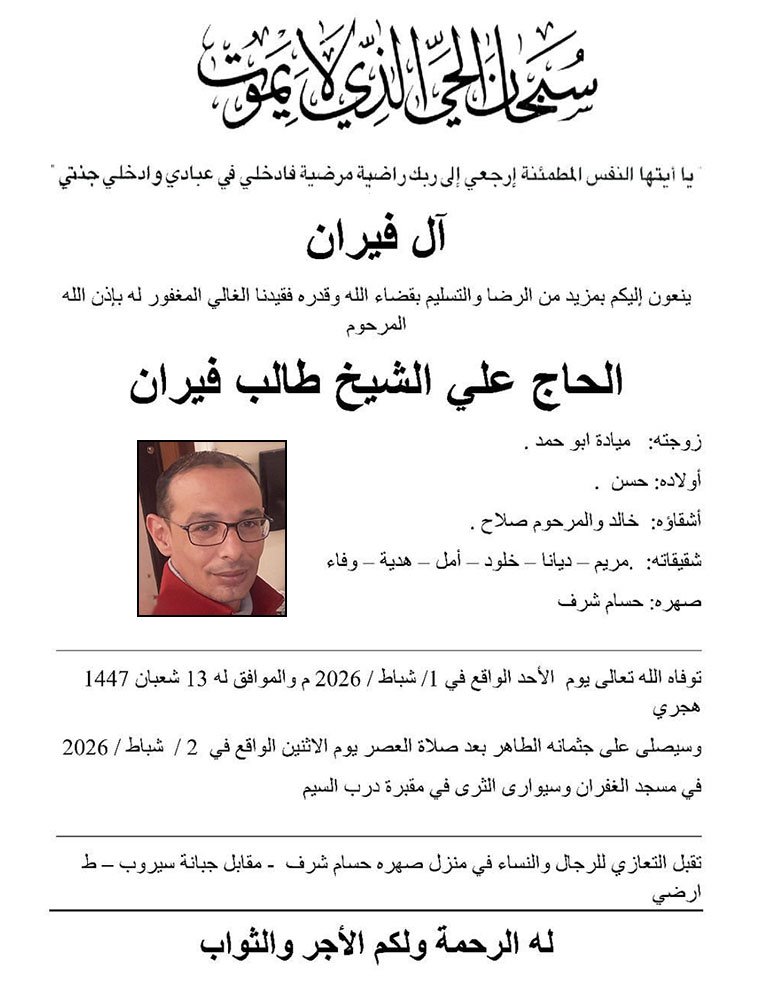 الحاج علي الشيخ طالب فيران في ذمة الله