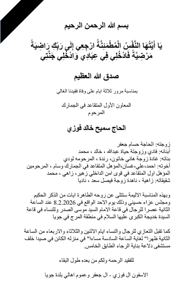 الحاج سميح خالد فوزي (المعاون الأول المتقاعد في الجمارك) في ذمة الله