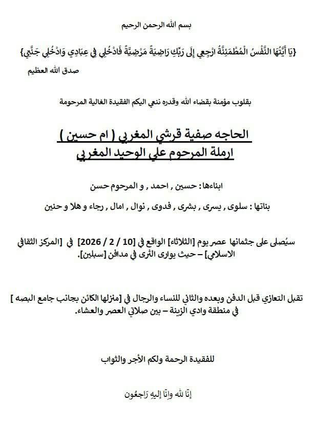 الحاجة صفية قرشي المغربي (أم حسين - أرملة على المغربي) في ذمة الله
