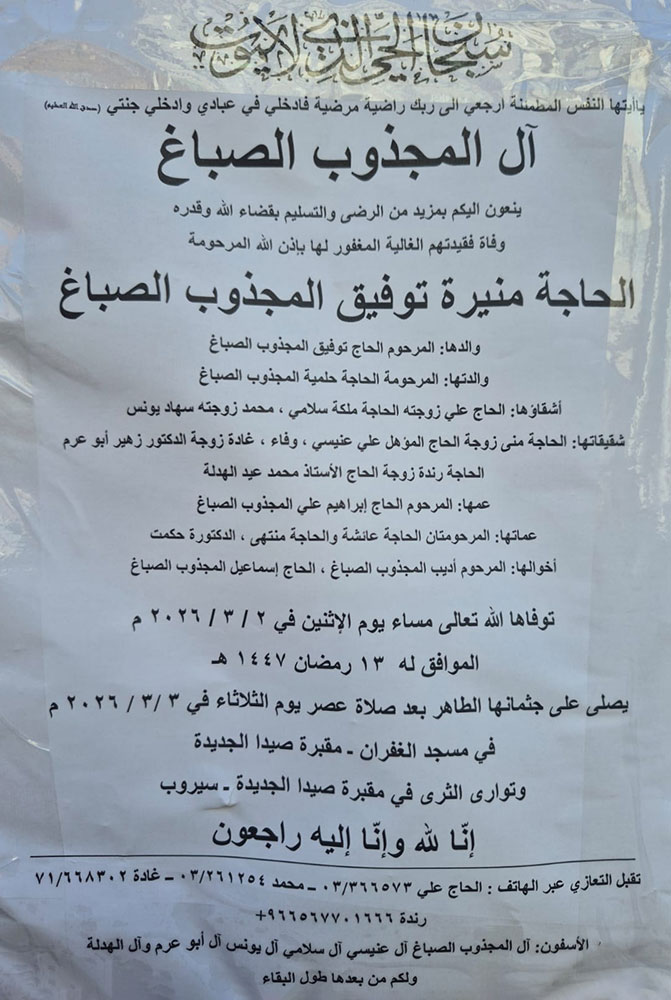 الحاجة منيرة توفيق المجذوب الصباغ في ذمة الله