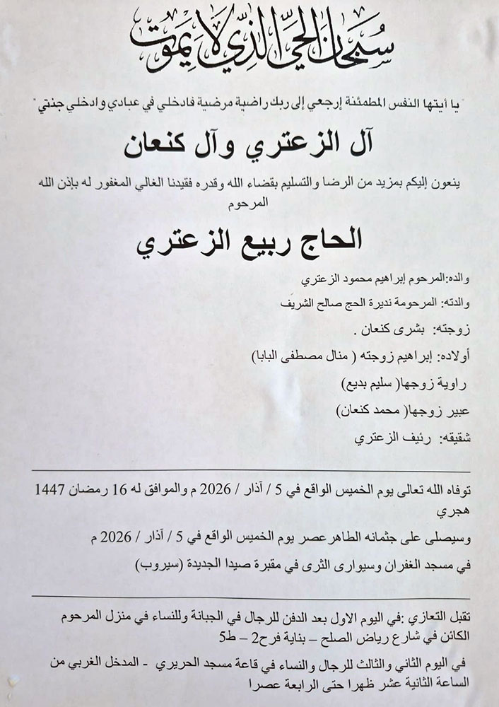الحاج ربيع إبراهيم الزعتري في ذمة الله