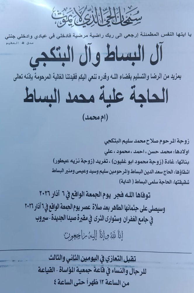 الحاجة علية محمد البساط (أم محمد - أرملة صلاح البتكجي) في ذمة الله