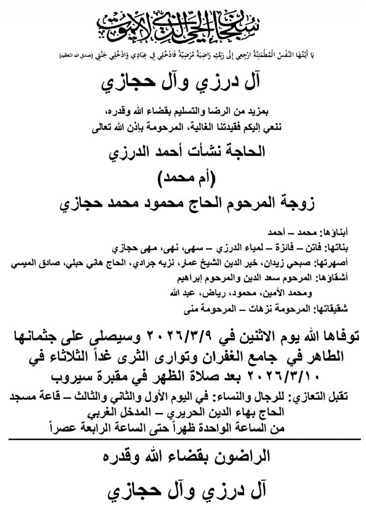 الحاجة نشأت أحمد الدرزي (أم محمد - أرملة الحاج محمود حجازي) في ذمة الله