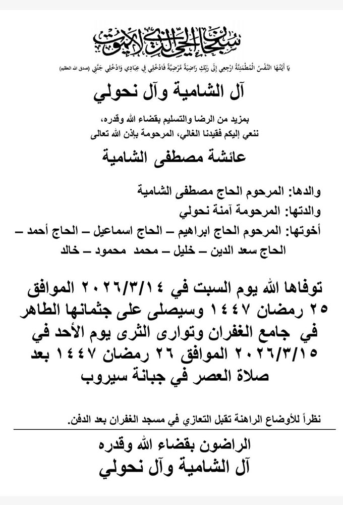 زينة مصطفى أيوب الشريف (زوجة محمد حبلي) في ذمة الله