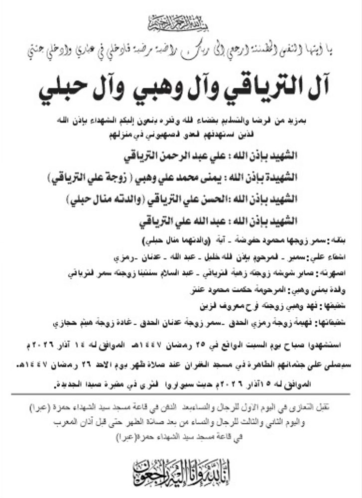 الشهداء علي الترياقي وزوجته يمنى وهبي وولداه الحسن وعبد الله في ذمة الله