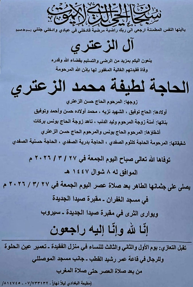 الحاجة لطيفة محمد الزعتري في ذمة الله