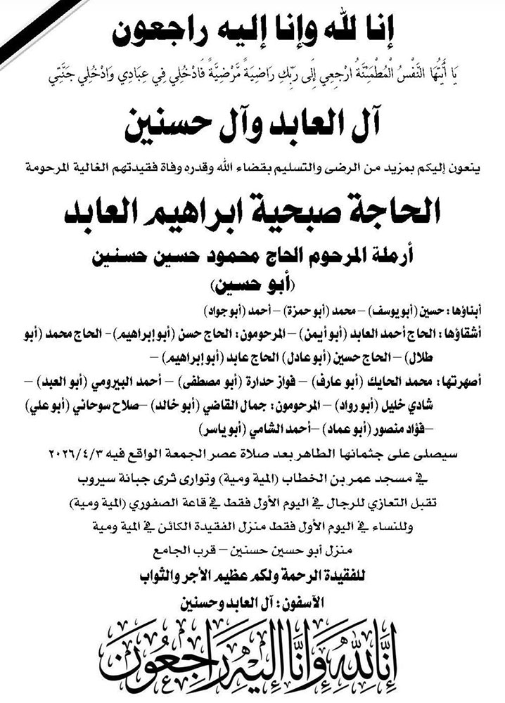 الحاجة صبحية إبراهيم العابد (أرملة الحاج محمود حسنين - أبو حسين) في ذمة الله