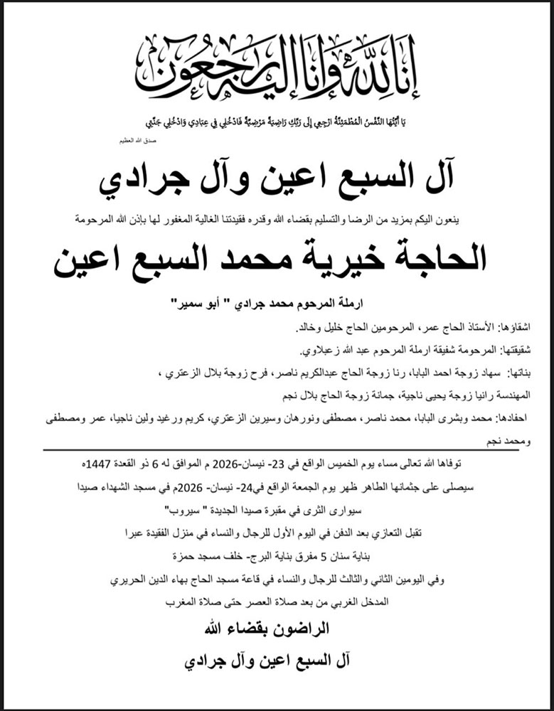 الحاجة خيرية محمد السبع أعين (أرملة محمد جرادي - أبو سمير) في ذمة الله