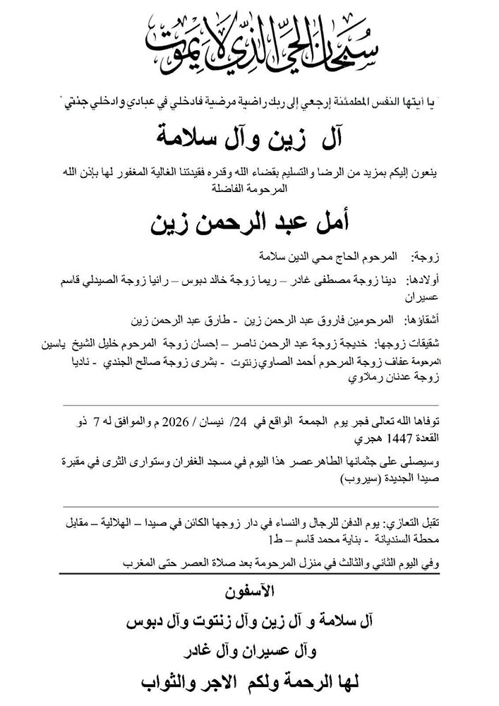 أمل عبد الرحمن زين (أرملة الحاج محي الدين سلامة) في ذمة الله