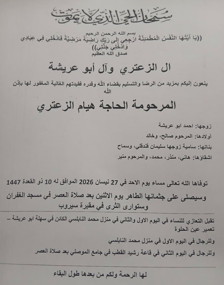 الحاجة هيام الزعتري (زوجها أحمد أبو عريشة) في ذمة الله