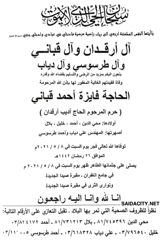 الحاجة فايزة أحمد قباني (أرملة الحاج أديب أرقدان) في ذمة الله