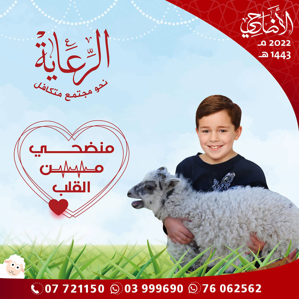 الرعاية تدعو أهل الخير للمشاركة الكثيفة و تضحية من القلب هذا العام في مشروع أضاحي العيد لمساعدة اكبر عدد من العائلات المتعففة التي هي بحاجة وتعجز عن تأمين اللحوم لبيوتها منذ عدة أشهر حيث تترجم بذلك أقصى درجات التضامن والتكافل في مجتمعنا المحلي لندخل السرور الى قلوبهم.